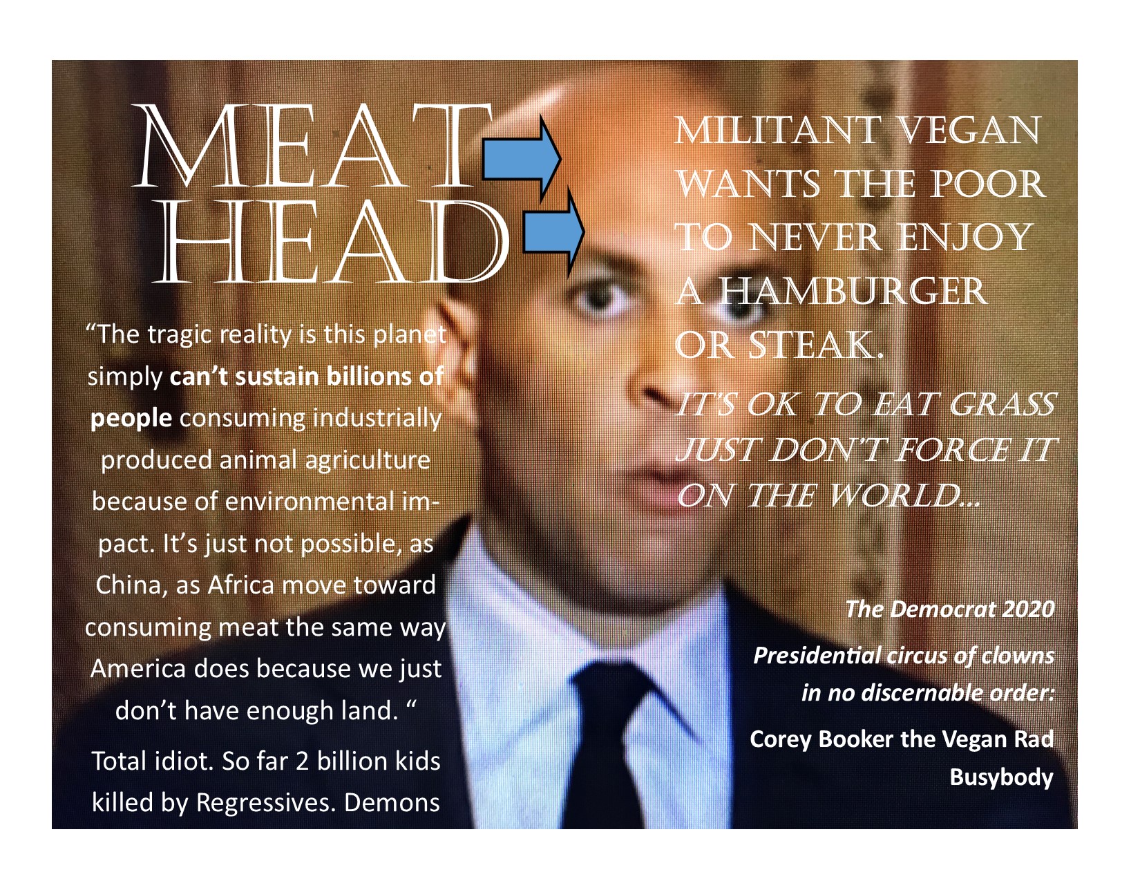 Meathead Booker, one of the Democrat 2020 circus parade of clowns, preaches meat as evil and wants cows eliminated. Knock yourself out, grass eaters, you have every right to chow down weeds and will probably live longer than some, not as long as others: but this omnivorous human has teeth designed for spinach AND steak. And, as if time IS short for the evil one’s last hurrah, out of no where, a pediatric neurologist says “Comfort the bastard while mom decides if she wants to do diapers right now with dad”