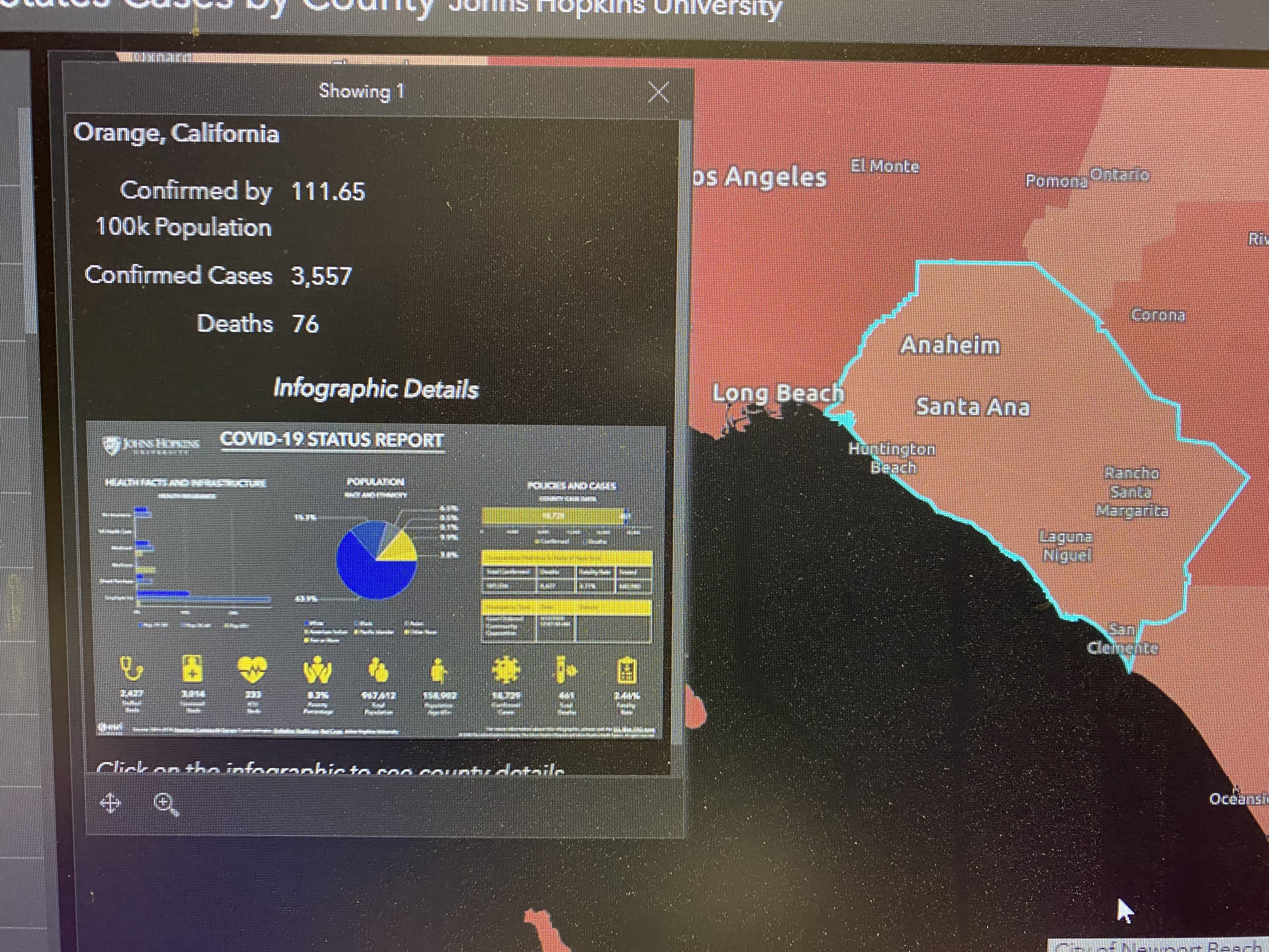 As of 3am this May 13th for the OC was .0023%, significantly less than traffic accidents, not to mention the flu. Which is rarely mentioned, especially since figures lie and liars figure: we can’t trust the stats, what with co-morbidty reasons for death are ignored: the hospitals, though laying off nurses etc because the silly banning of most elective ops, get a lot more money if Covid19 appears on the death certs. Truth and diagnosis is optional.