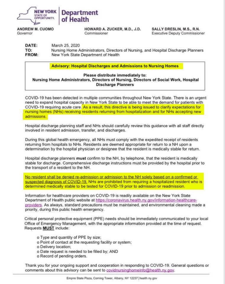 This memo dated March 25th, was exec ordered in NY by Cuomo long after we knew so much more about the virus. What complicates things for Cuomo is the millions nursing home execs paid into Cuomo’s campaign coffins. err coffers. Speaking of coffins, nursing home execs were immunized from liability quid pro quo.