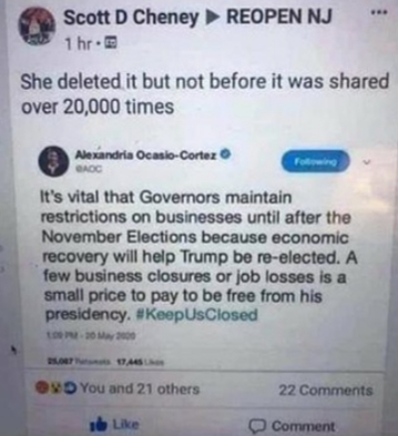 Quote: “…a few business closures and job losses is a small price to pay to be free of (Trump)~AOC. Parse this comment: she thinks she and her radical Alinsky leftist anarchists own you and your family, your business and your wealth. This “few” is really thousands of business are being destroyed and millions left in the jobless state of depression. What an evil woman.