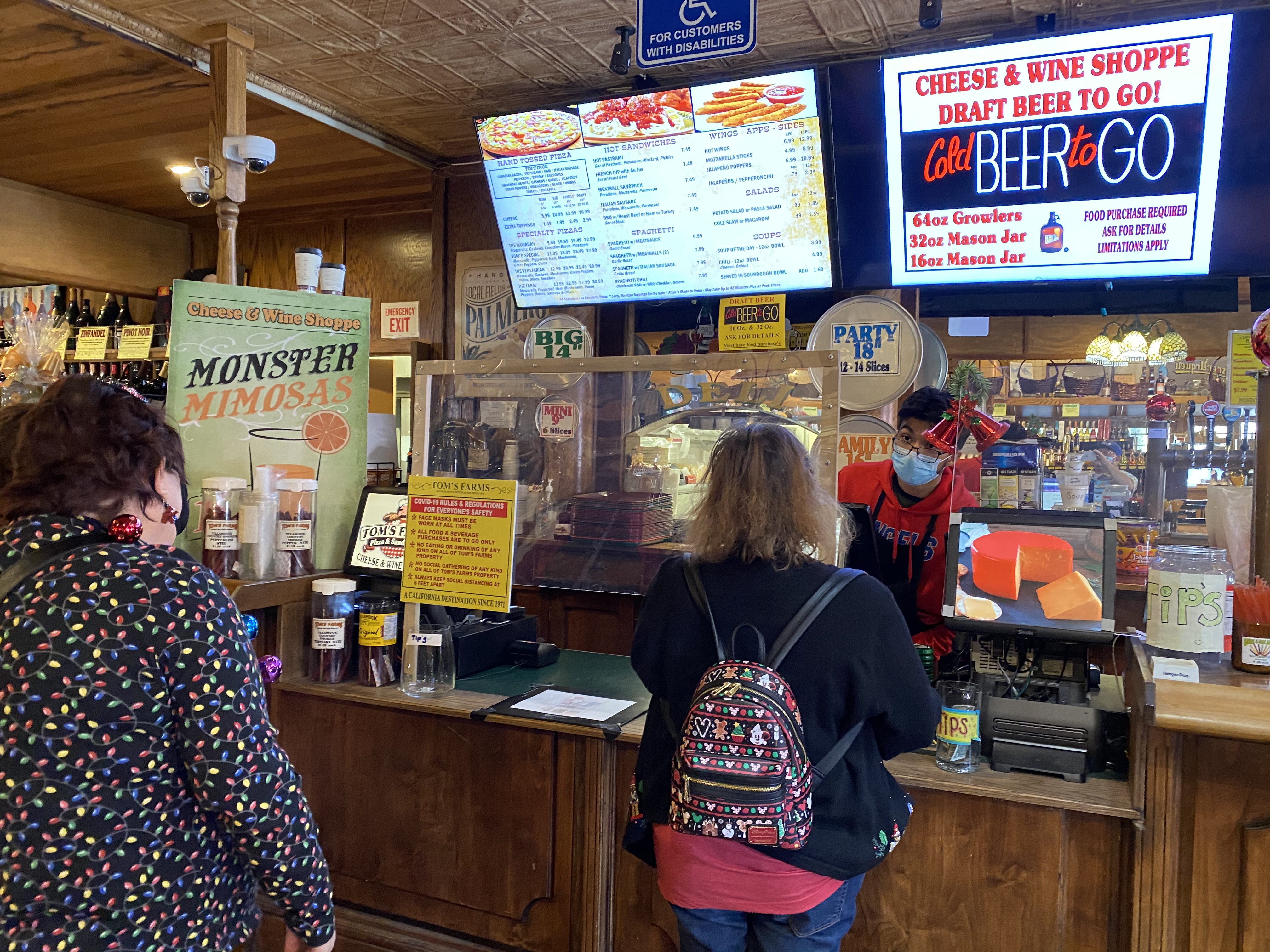 Tom Farm Pizza clerk requests the mask up to the eyes. He is secure behind CoviDeath bullet proof glass
