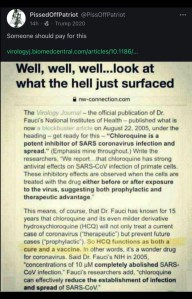 On a recent broadcast Dennis Prager put it well that we aren’t hurt taking HCQ with the risk near zero and death is pretty much final when you die from Covid; in fact Norway has a crimes against humanity case at the Hague regarding those who have suppressed the use of HCQ. Even the Saint of DC, Anthony Fauci, recommends this regimen to cure and prevent/prophylactic the Plague.