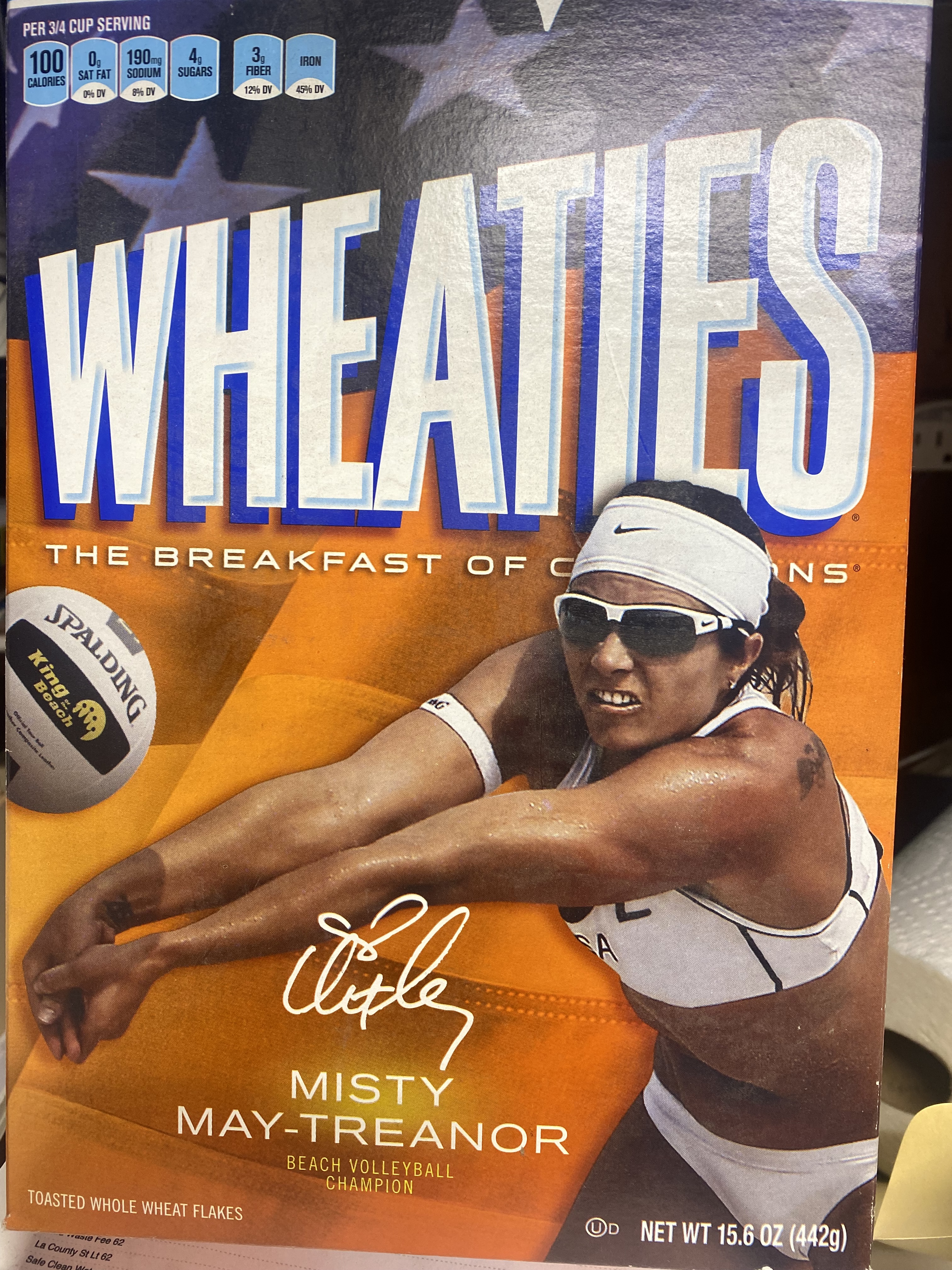 Will Lia, did you ever hear of Michael Phelps? He too appeared on a Wheaties box, appearing on store shelves about the same time a fine lady super athlete named Misty did. Incidentally, The Wheaties cereal box has been graced with American athletes since 1934, starting with the baseball great Lou Gehrig.