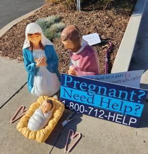 A beloved Nativity scene featuring the 2nd Eve, the Virgin Mary, a righteous and Godly husband and foster father, Joseph and of course, Emanuel coming as Jesus the Christ was placed at the foot of Planned Parenthood’s flag ship institution at 700 N Tustin near the 22 fwy off ramp.