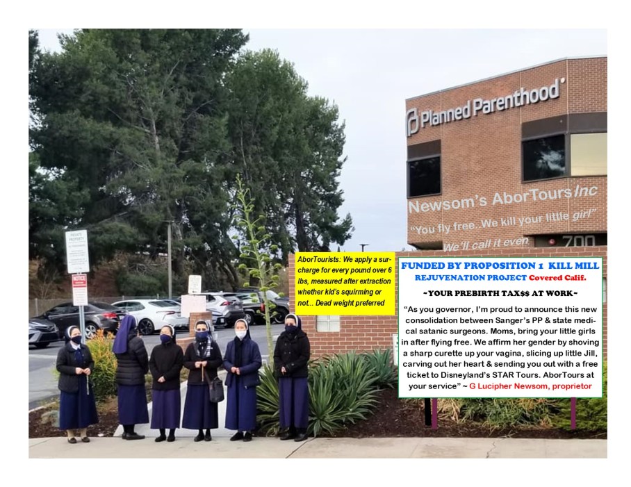 Plenty of unimpeded access to the mill, on the PUBLIC sidewalk, with plenty of room for those passers by, journeying south to north or north to south along Tustin Avenue in the holy city of Orange, CA. People could still gain access for a Covered California Pfauci Pfix “vax” shot or booster (the CoVax depop Pfizer Jabs with 5 million VAERS bad side effects and at least 50,000 dead), results of Mao Tse Xi’s Wuhan Plague. OR, also on the kill mill’s service menu, the removal of a living human to honor the Newsom Twosome’s latest business, AborTours, LLC.