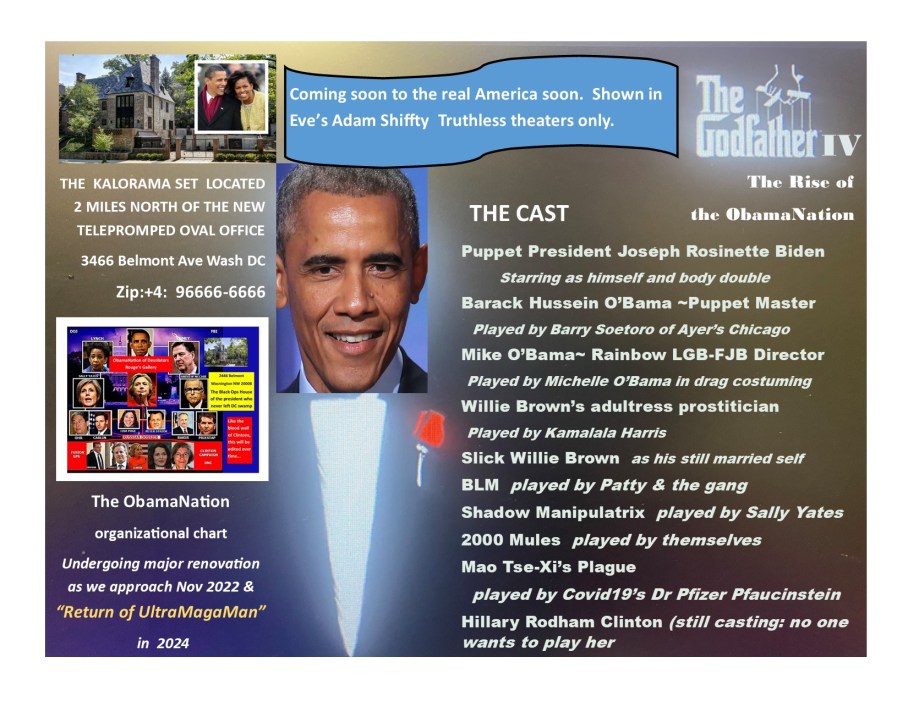 …and (2) the ObamaNation of Barack and Susan Rice who puppet Mr Biden into destroying our great land with lies and pilfered trillion$.  You’ve seen the new godfather of the swamp.  The movie “Godfather IV”, produced by the Obamanation Film division, is underway. Pictured here is the trailer.