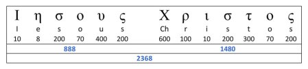 Supposition: we need to prove 8 is Jesus’ number. In fact His name alphanumerically is 888 as the graphic shown here. Greek and Hebrew assign numbers to their letters…and translated, Jesus becomes 888.