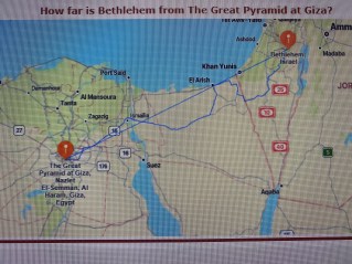Bethlehem, just south of Jerusalem, is 270 miles to Giza if you travel southwest, skirting the Middle Earth Sea (Mediterranean)along the directional vector built into Giza.