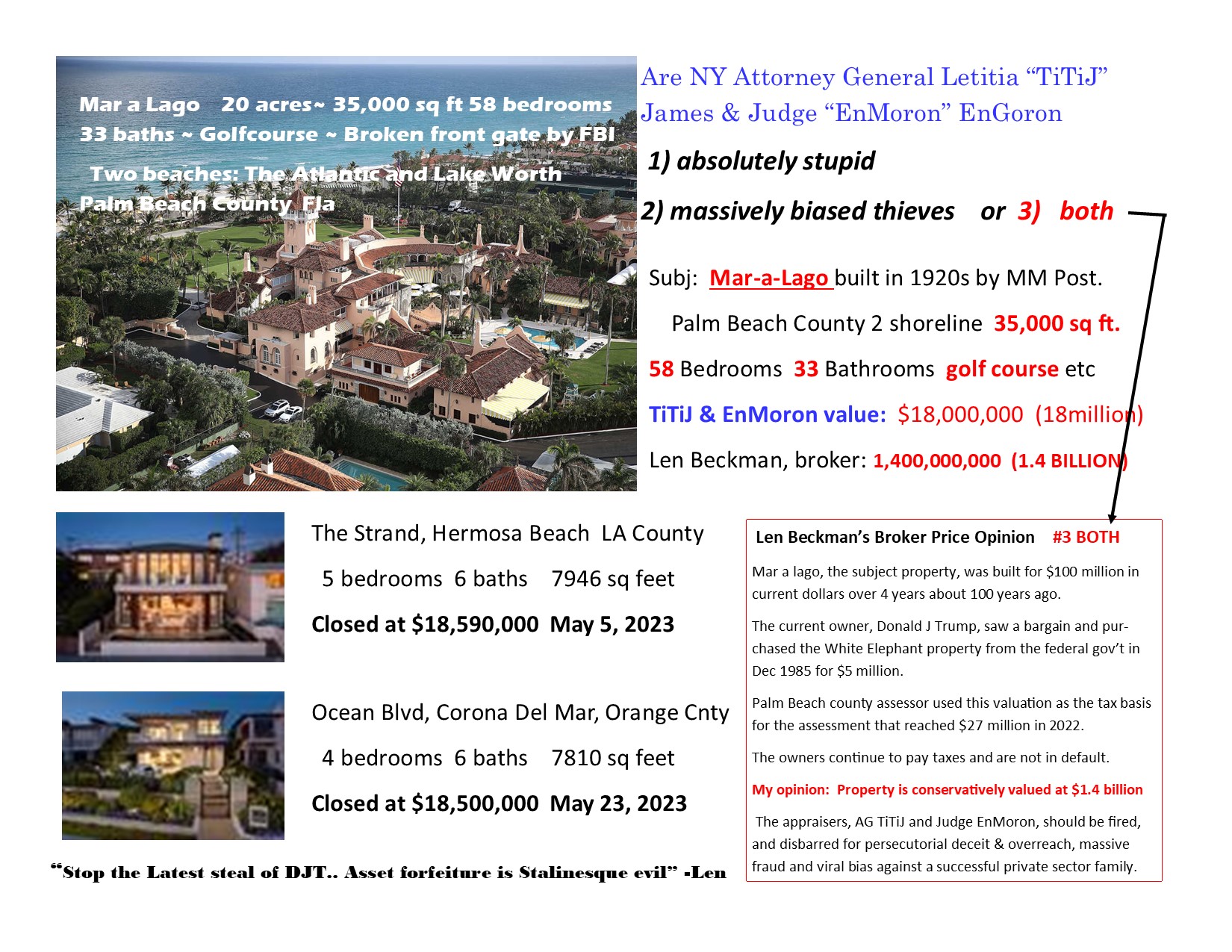 her entertaining that she willed to the Federal Government to be the Winter White House in the future.  Since the Fed government often does not keep “white elephants” due to cost of upkeep, Trump purchased the world’s largest home at one of the most valuable spots on earth for $5 million in 1985 and invested millions more. We know it is located near 2 acre land parcels selling for $200 million.  Plus a brief interstate broker price opinion appraisal is pictured here (this author is a licensed real estate broker with 35 years experience in the state of California) to show that when Judge EnMoron values Mar-a-Lago at $27 million, his willful hate overshadows any remote intelligence he might still have at this stage.                My educated and experienced valuation is $1.4 BILLION.  Not only are two acre lots nearby selling for $200 million, but demonstrating this property is certainly one of the world’s most valuable properties is easy.